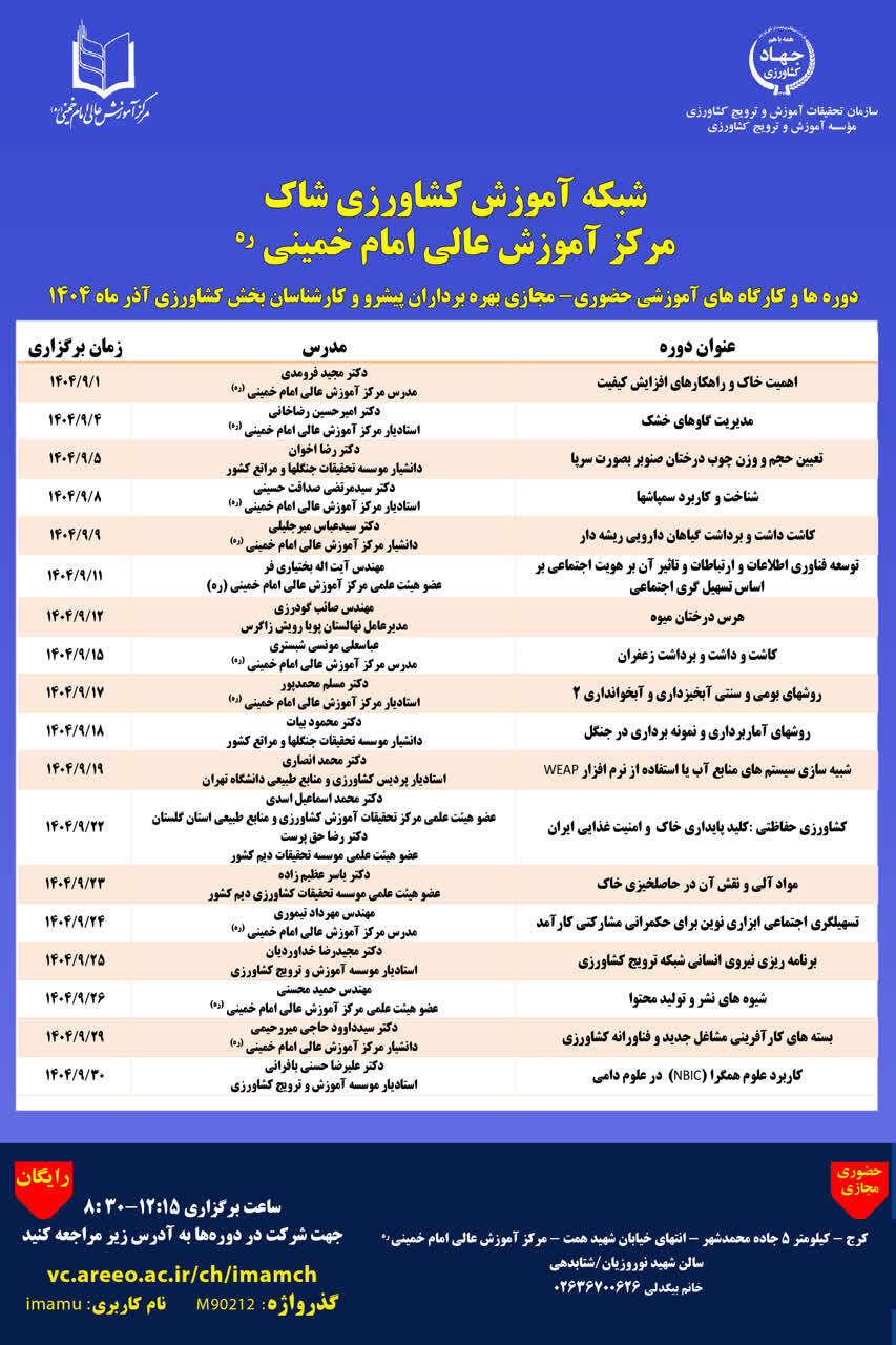 دورهها و کارگاههای آموزشی حضوری- مجازی بهرهبرداران پیشرو و کارشناسان بخش کشاورزی طبق برنامه داده شده در مرکز آموزش عالی امام خمینی (ره) برگزار میگردد.